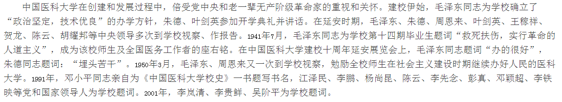 目前,中国医科大学已发展成为具有办学特色和国际影响的医科大学,在医学、药学、教育学、理学、工学、管理学等学科门类中已形成研究生教育与本科教育并重、兼有其他教育的多层次的人才培养体系,是国家高层次医学人才培养和医学科学研究与技术创新的重要基地,也是我国与日本、欧美等国进行国际医学教育、学术交流的重要窗口。中国医科大学是卫生部原部属的10所高等学校之一,2000年3月全国高等学校管理体制改革,学校由卫生部划转为省部共建、以辽宁省管理为主。
